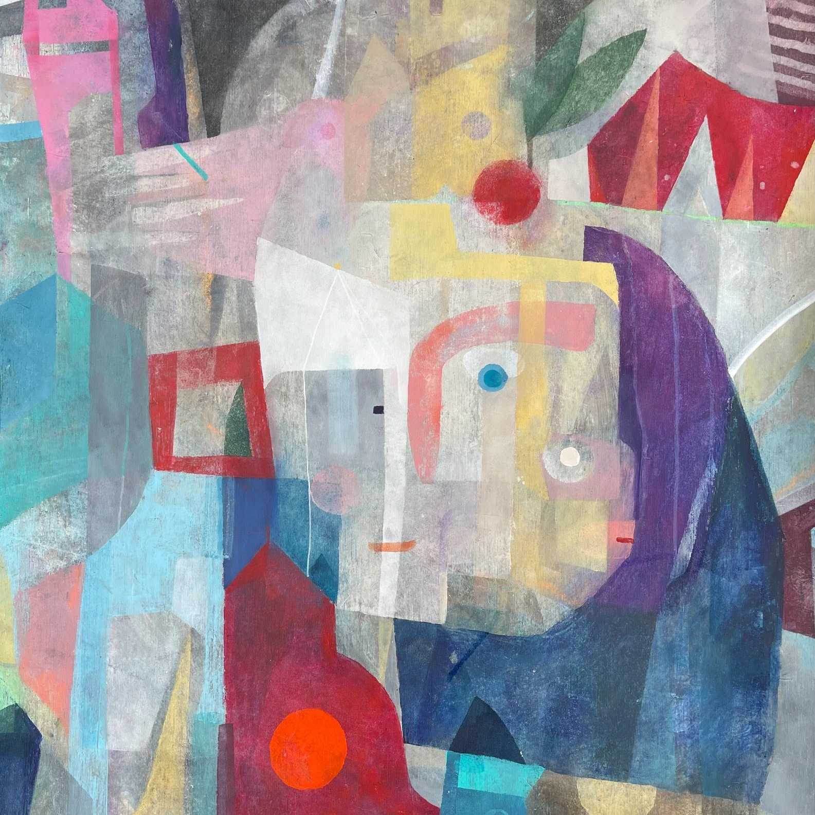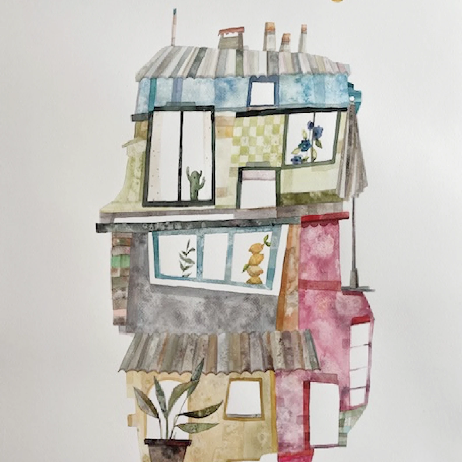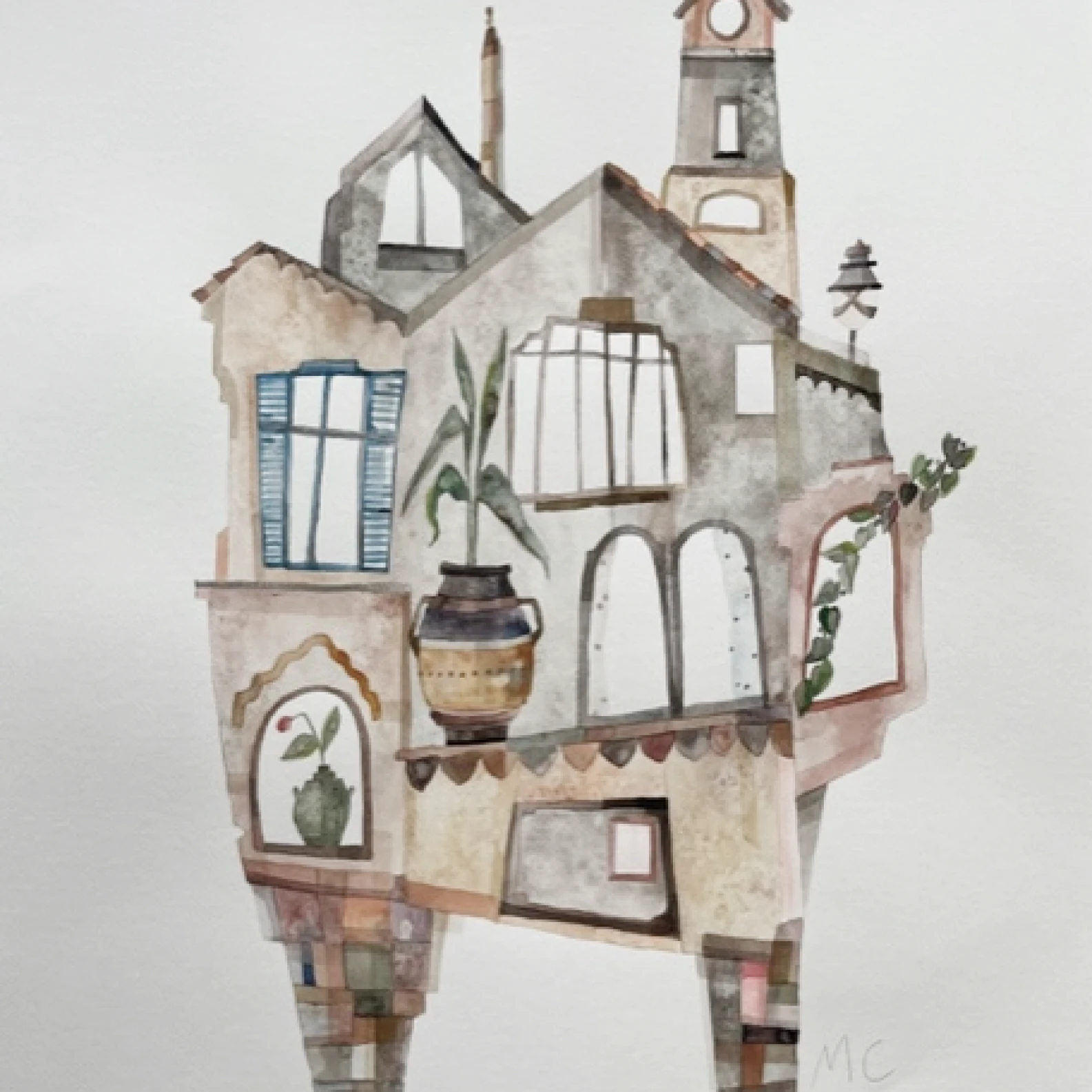 Within her work, one can perceive architectural elements like house forms and facades, seamlessly integrated into the artwork. Maria employs a diverse range of colors, from delicate pastels to dynamic palettes, using a meticulous layering technique to gradually reveal details and figures, inviting viewers on a captivating journey of discovery within her art.