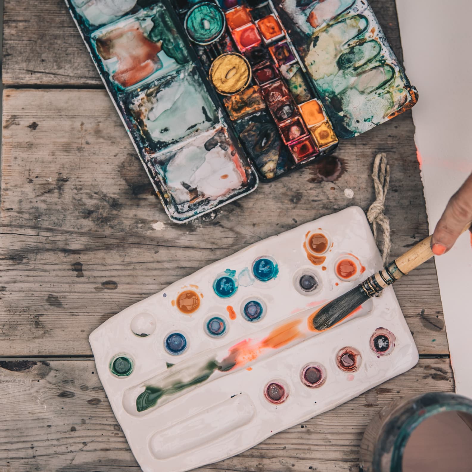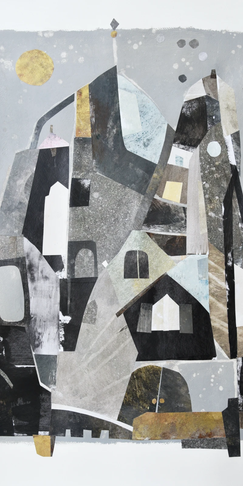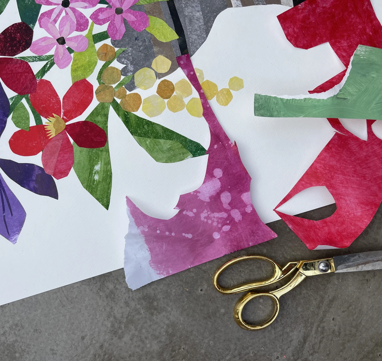 Collages created from hand-painted paper, that are glued together to form compositions.