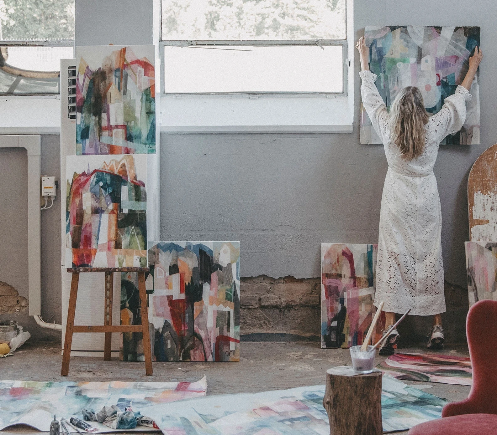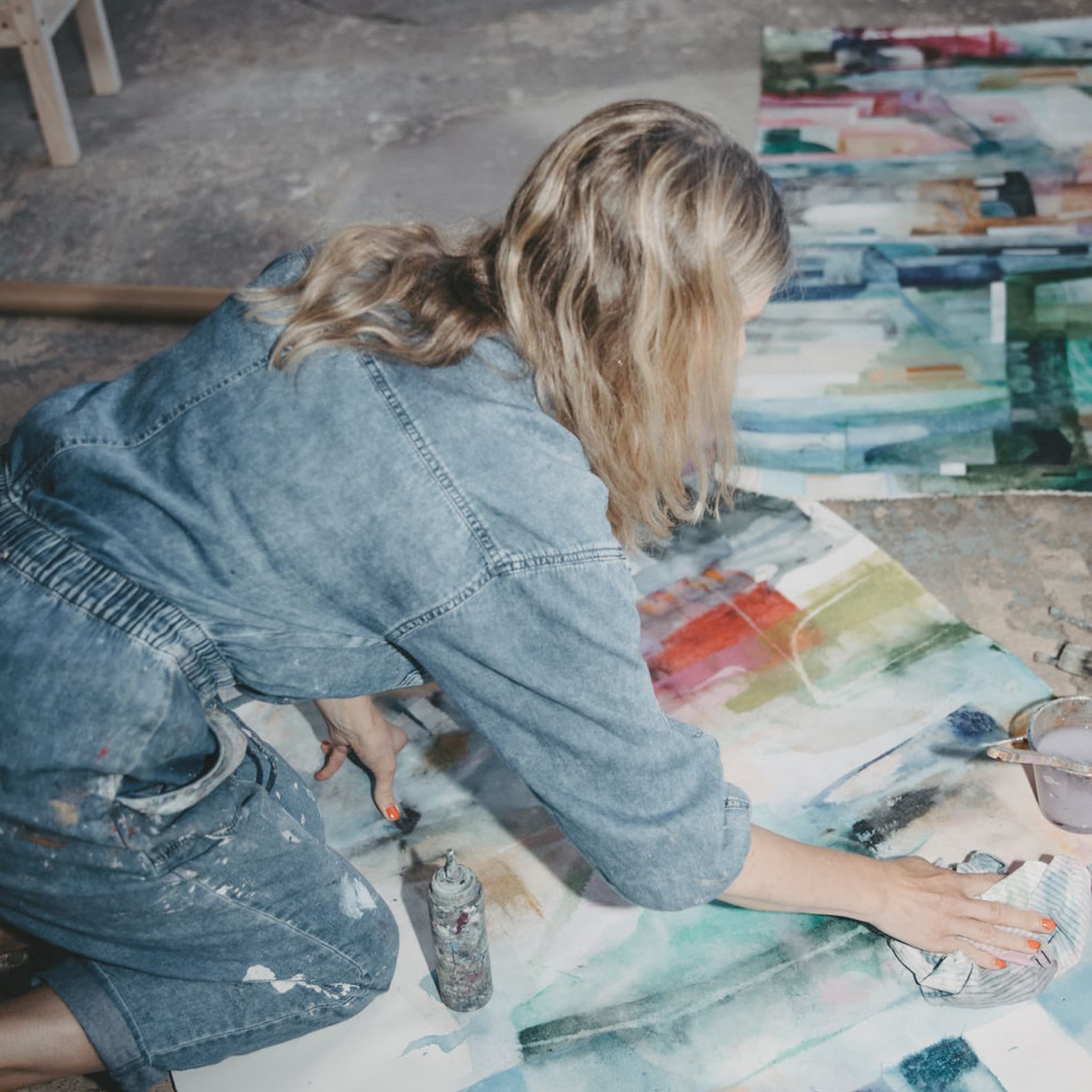 Maria's acrylic paintings are often inspired by cities and buildings or drawn directly from her imagination. She frequently works in many thin layers. During the painting process, she tries not to overthink and instead lets the colors flow and shape themselves freely. It is in the later stages of the process that Maria tidies up and molds the motif into its final form.