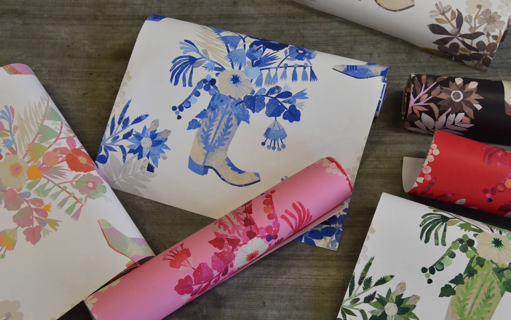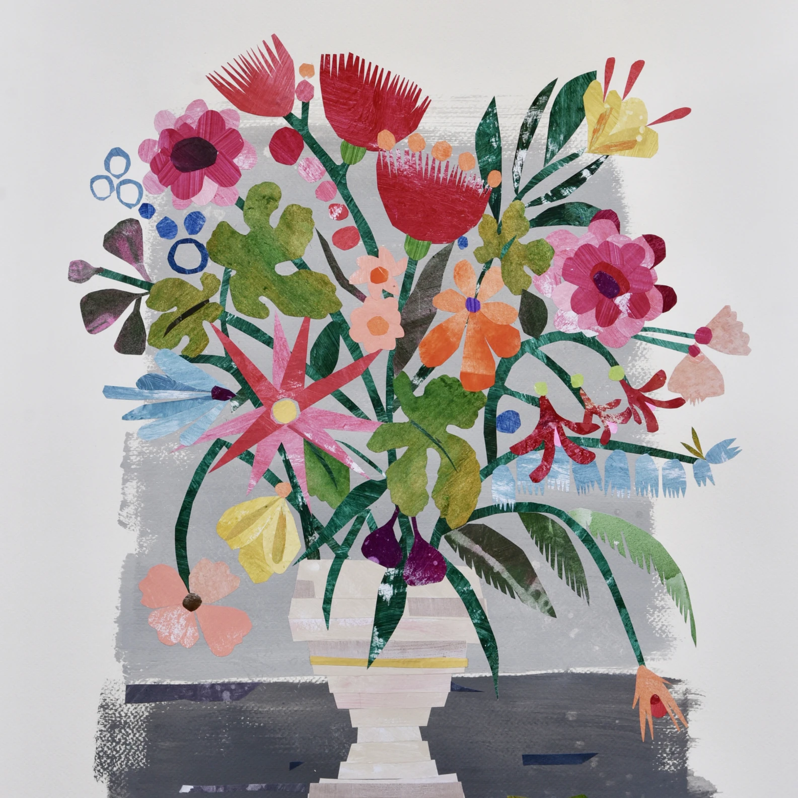 Creating collages is like solving a puzzle and constructing for Maria. She cuts shapes from hand-painted paper, which are then glued together to form a composition or a motif. The subjects can, for example, be inspired by a house she encountered during a journey or a bouquet of flowers gathered from her garden.