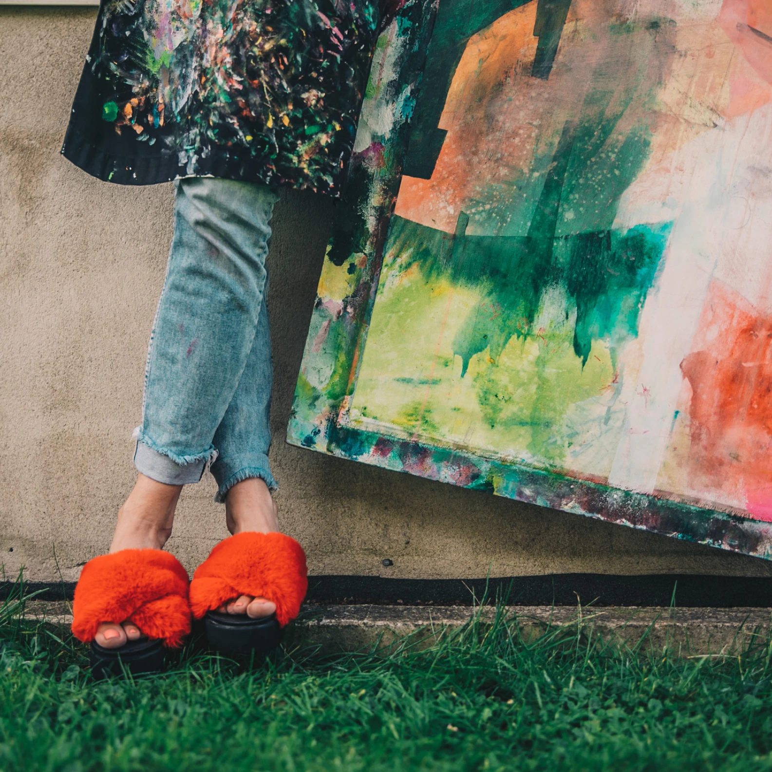 The colorway is very important to me when I paint. I love to combine as many colors as possible at the same time. Contrasts like strong colors versus bright pastels, plain versus structured and dark versus bright, in a cubistic, skewed and dreamy way.